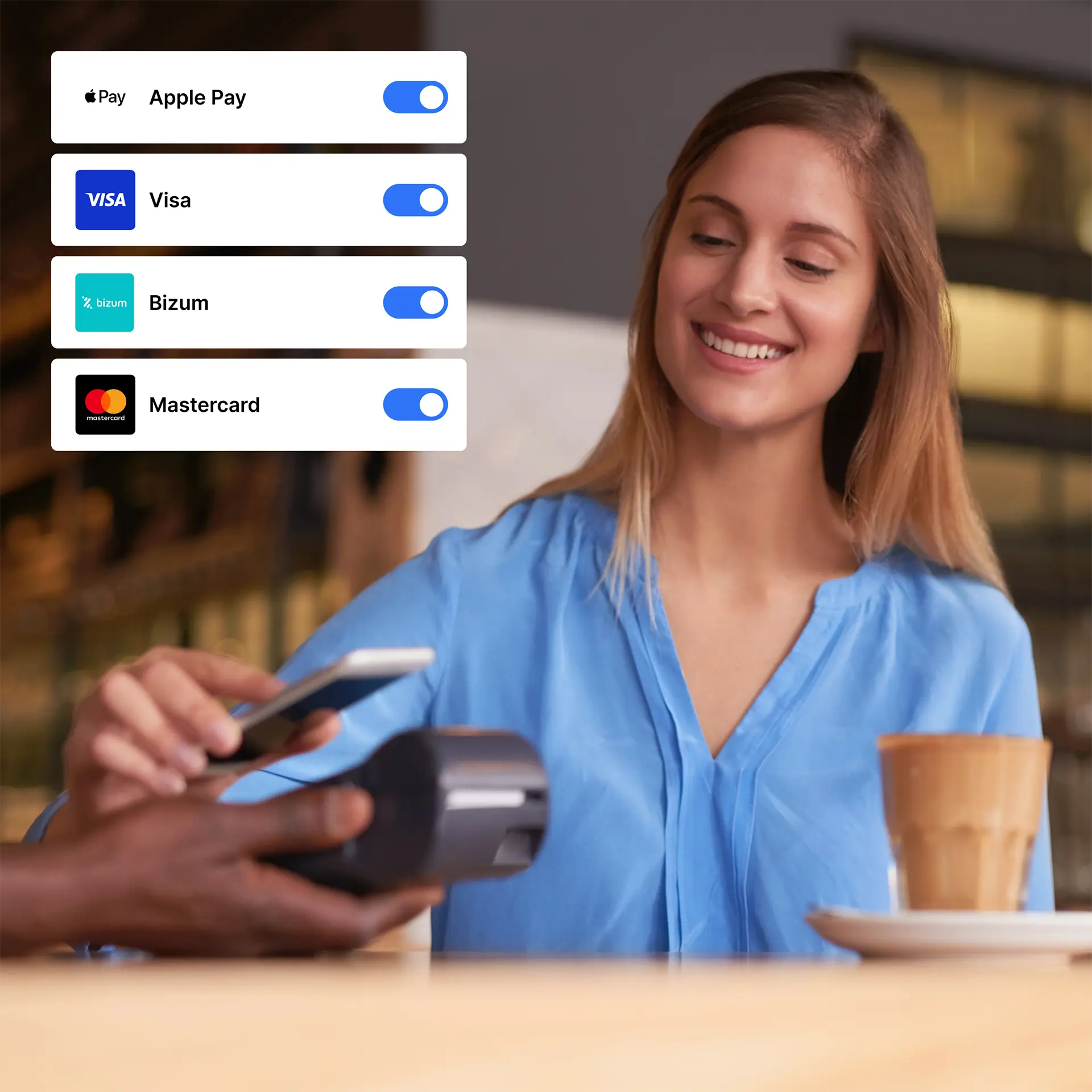 Cards, Bizum, Apple Pay, Google Pay, PayPal, and more. Accept online, in-person, or mobile payments from a single platform.