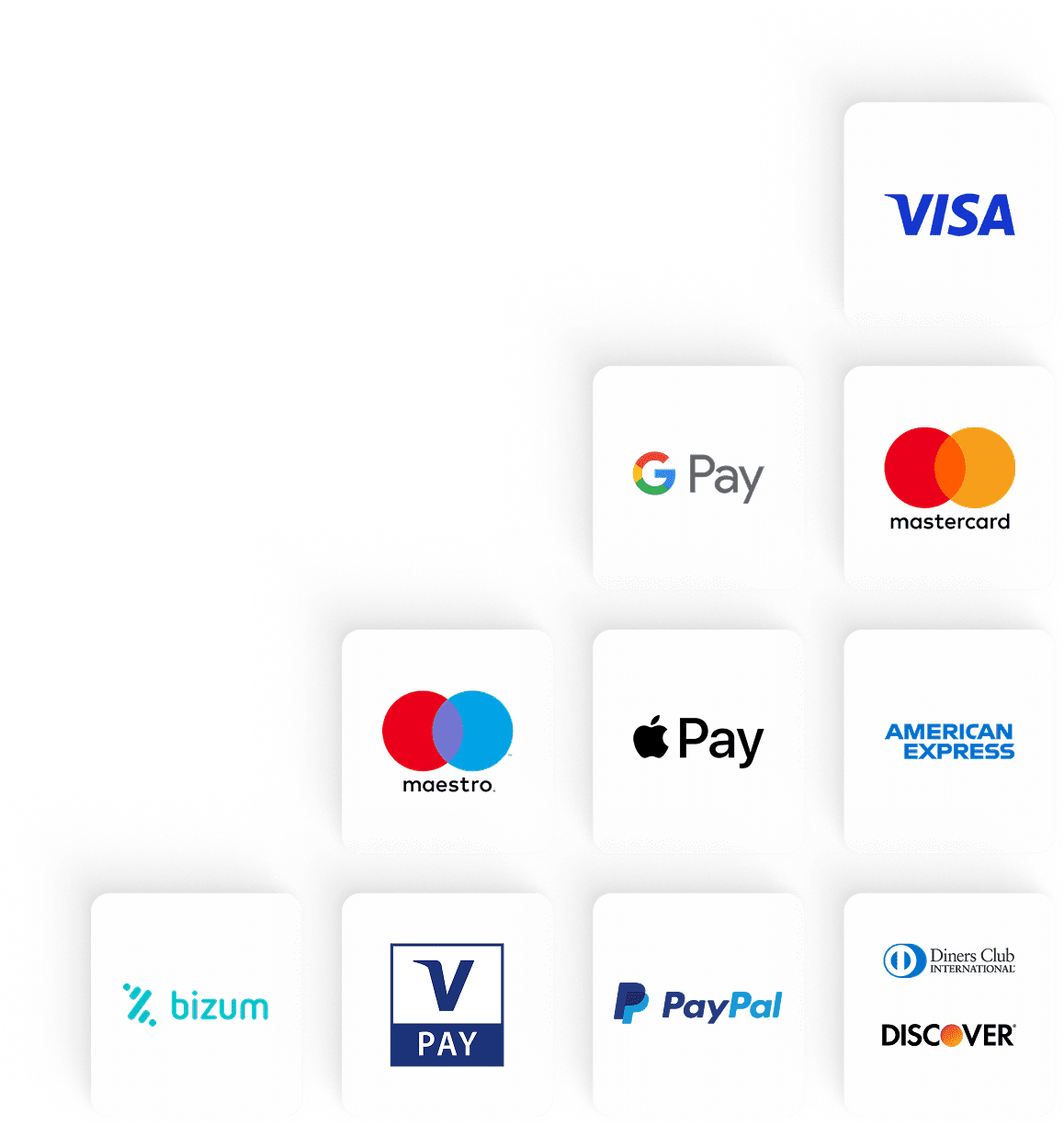 Una sola integración para tarjetas, Bizum, Apple Pay, Google Pay, Alipay+ y más. Maximiza conversión ofreciendo las opciones que prefieren tus clientes.