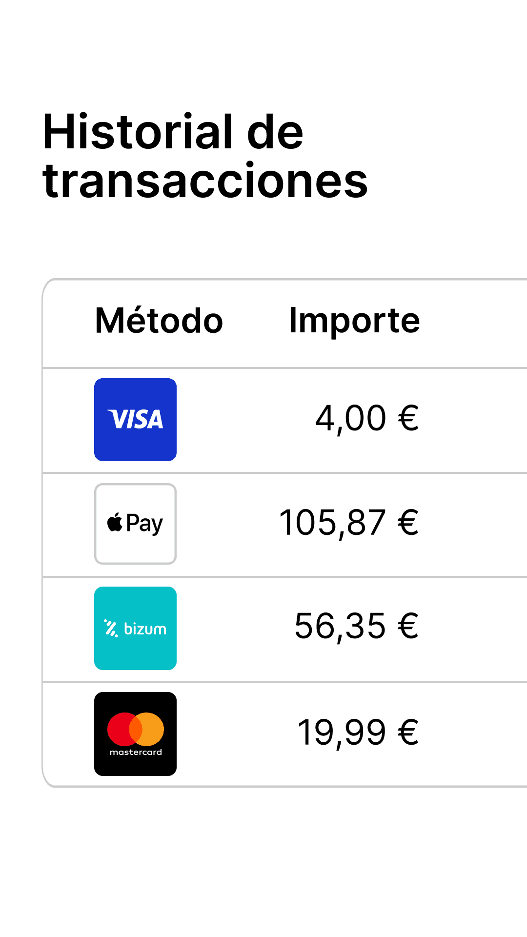 Una sola integración para tarjetas, Bizum, PayPal, Apple Pay y más. Maximiza la conversión ofreciendo las opciones de pago que tus clientes prefieren.