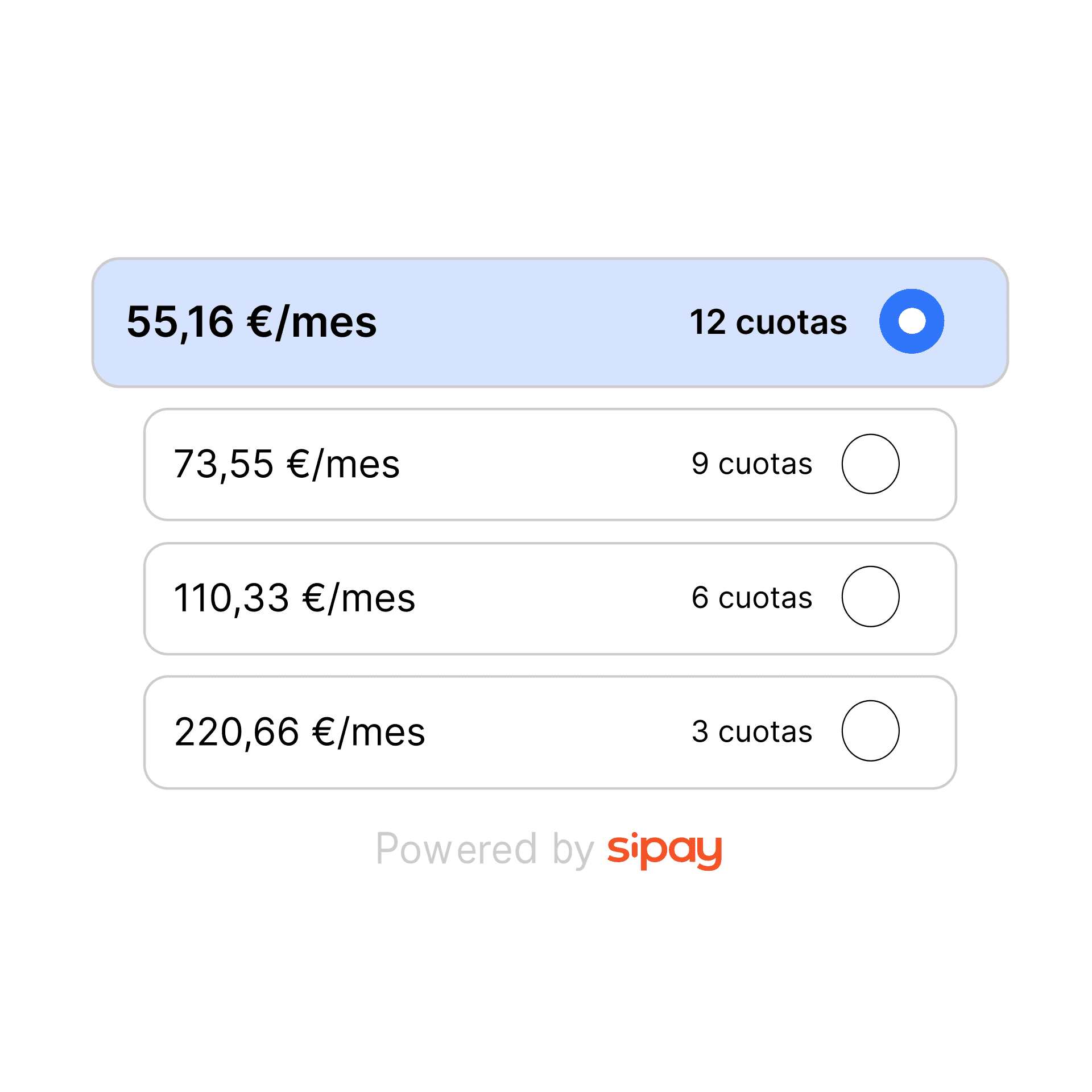 Permite que el cliente divida el importe de la compra en cuotas mensuales fijas para facilitar la venta.