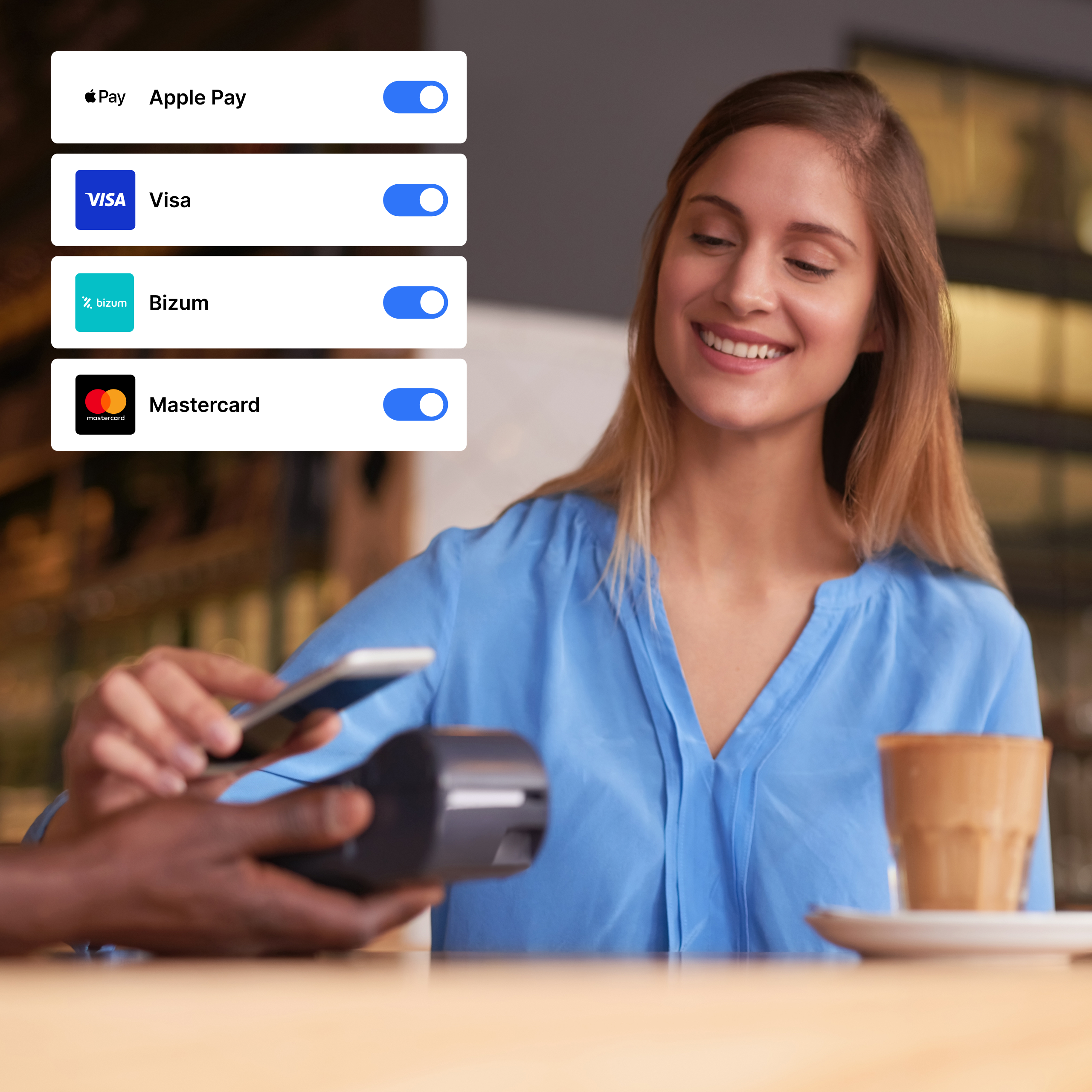 Tarjetas, Bizum, Apple Pay, Google Pay, PayPal y más. Acepta pagos online, en persona o por móvil desde una única plataforma.